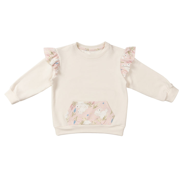 Su diseño tierno y encantador agrega un toque de dulzura a su estilo. Deja que tu bebé se sienta cómoda y abrigada con este buzo que celebra la ternura de la infancia. Cómodo y suave buzo para bebita con cuello redondo, color ivory o crudo con boleros en mangas y bolsillo en tela palo de rosa con estampado de conejos, puños y cintura en rib.